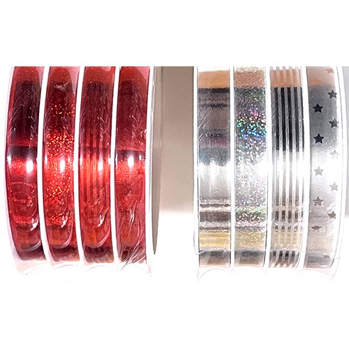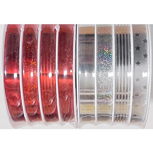 Präsent Weihnachts-Ringelband-Multispule,mtc; 10 mm x 24 m (4 x 6 m); 4-fach sortiert: Stern/Streifen/Holo/uni; Restbestand: 2x silber / 1x rot
