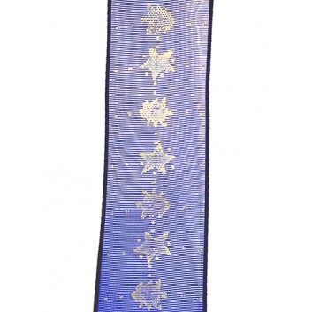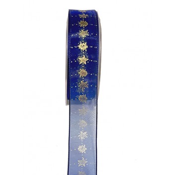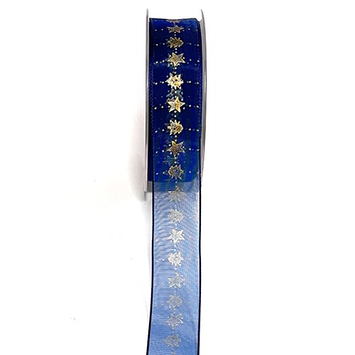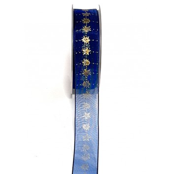 SWS Weihnachts-Geschenkband: Transparent; 25 mm x 25 m; Ontario; blau+Goldsterne; 28042-3590; Textilband: Tansparenteffektband; ohne Draht