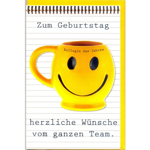 Skorpion Glückwunschkarte; 115 x 175 mm; Zum Geburtstag - Kollegen; Fotomotiv: Tasse mit Smile; Ku: gelb, naßklebend, Spitzklappe; Hochformat