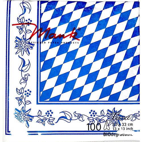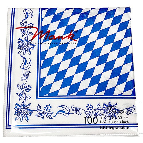 Servietten; 33 x 33 cm; Bayrisch Raute; weiß-blau; Mank-Zelltuch 3-lagig; 1/4-Falz (quadratisch); Inhalt: 100 Stück